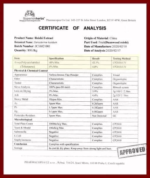 Speciální metodou dvojité extrakce získaný výtažek z 12měsíční Duanwood Red Reishi. Obsah betaglukanů víc než 40 % a triterpenoidů víc než 4 % zajišťuje vysokou účinnost produktu.