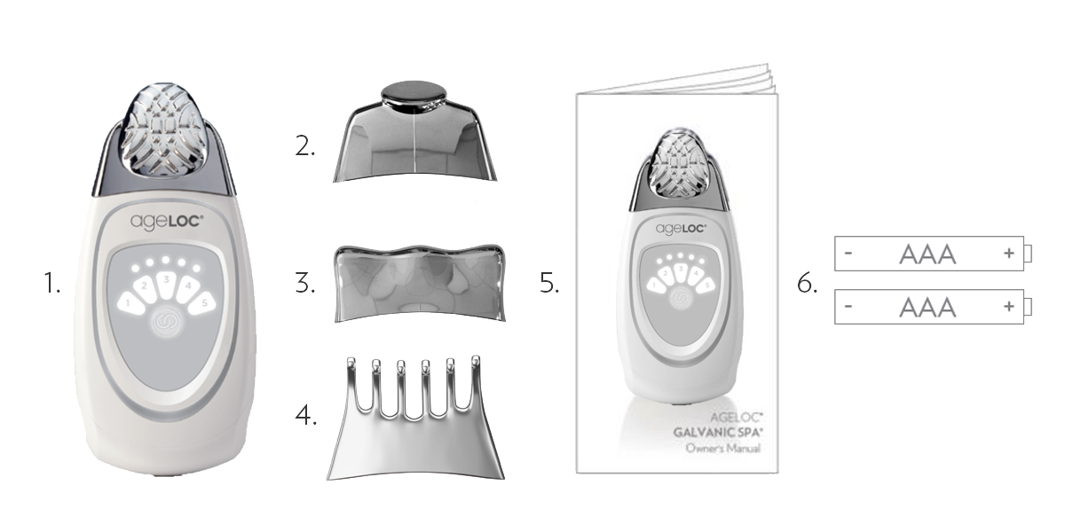 Přístroj ageLOC Galvanic Spa obsahuje značkový, patentovaný nástroj se čtyřmi vyměnitelnými nástavci. Nástavce jsou vyrobeny z ABS - akrylonitril-butadien-styrenu - s galvanicky pochromovaným povrchem. Po použití otřete vlhkým hadříkem a osušte suchým.