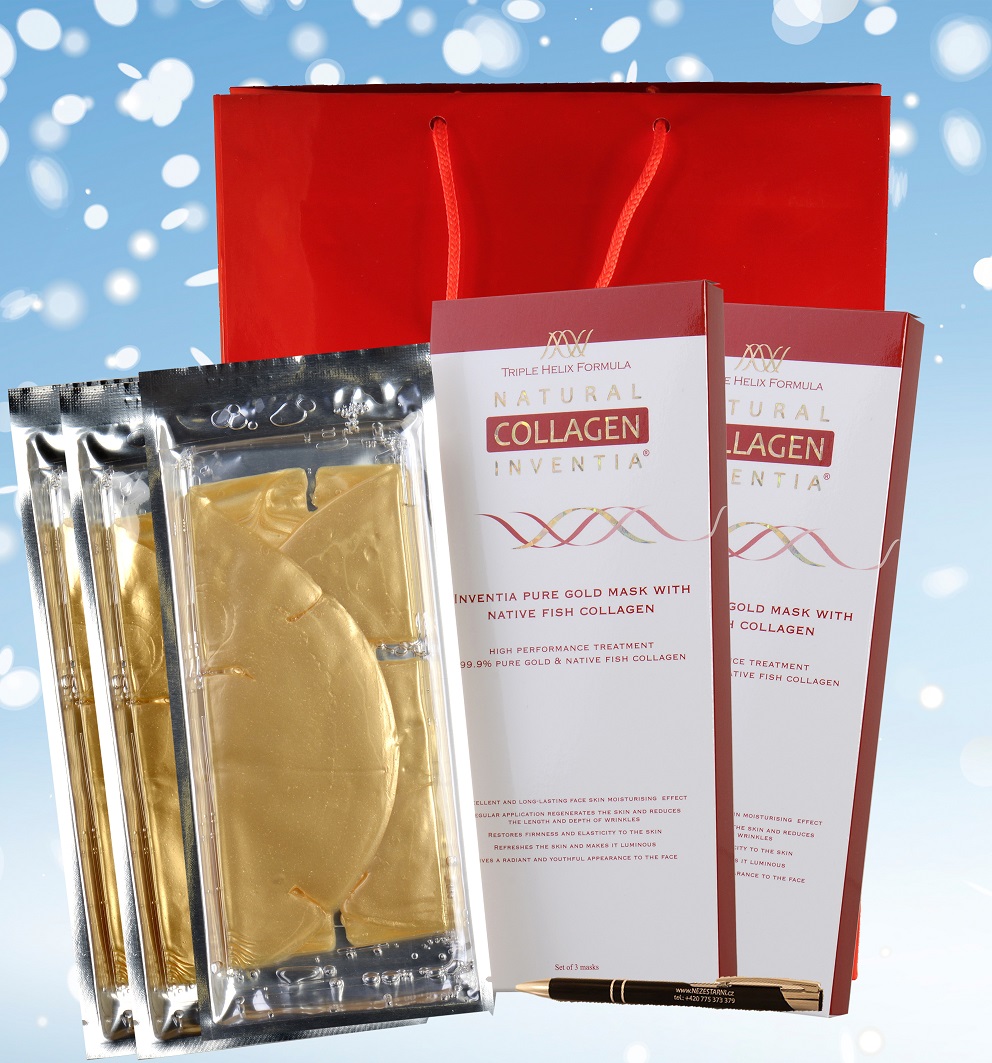 Balíček - ZLATÉ MASKY s ŽIVÝM KOLAGENEM  obsahuje 2x3 masky s jemnými částečkami 99,9% čistého ryzího zlata, dárkovou tašku s propisovačkou.